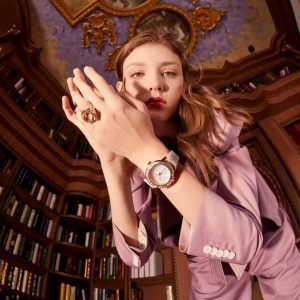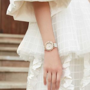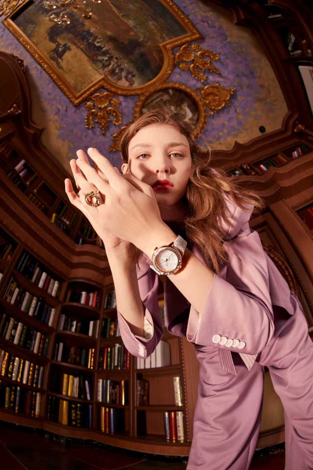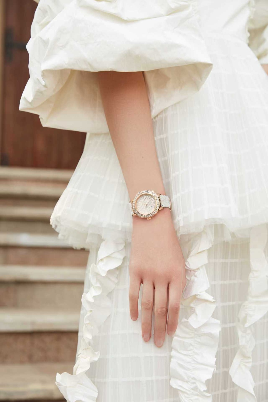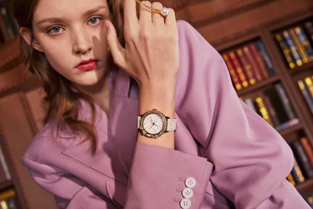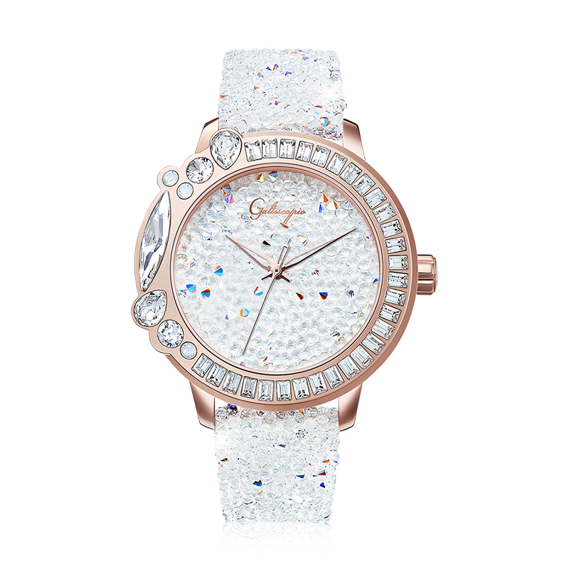 使他們的光澤和獨特的外觀精緻繁密不規則地隨意散佈於腕錶之上,讓水晶閃耀變奏出不一的光芒,